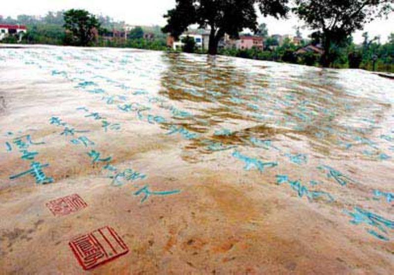 據(jù)書寫該賦的我市知名書法家、本報編輯張弢介紹,當時把這賦轉(zhuǎn)移到巨石上頗費了些周折,“是書法與現(xiàn)代科技的結(jié)合!”書寫后先掃描到電腦里放大,然后制作出一張500多平方米的大紙,鋪在巨石上。接著,將字體部分挖空,用刷特制漆涂在上面,最后風干后揭開紙,于是,巨大的文字便成功“印”在了巨石上。這項工程動用了20名工匠,耗時整整兩個月才完成!
