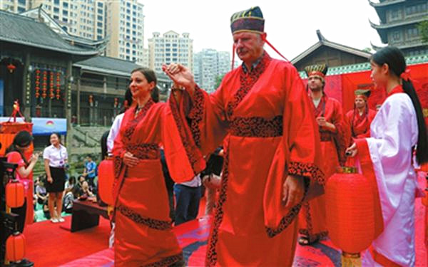 在南溪古街,由12名歐洲熊貓粉絲傾情演繹的漢式集體婚禮成為線路考察中的一大亮點(diǎn)。在悠揚(yáng)的誦讀聲中,身著漢式服裝的“新人”依次入場,禮道兩旁的侍女持宮燈引導(dǎo),新人行拜堂、沃盥、對席、同牢、合巹、結(jié)發(fā)、執(zhí)手禮,整套漢式婚禮禮儀逐一演繹,讓習(xí)慣了婚紗禮服的老外們親身感受了一番中國傳統(tǒng)婚俗文化。在這里,與會嘉賓們還實(shí)地參觀了著名小吃“南溪豆干”的制作流程,欣賞了極具當(dāng)?shù)靥厣墓艠繁硌荨?