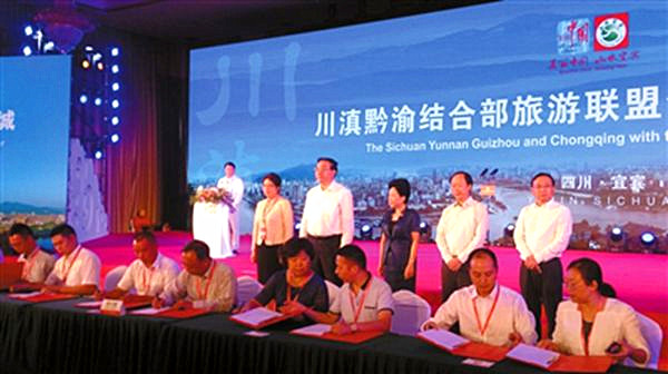 開幕式剛剛結(jié)束,川滇黔渝結(jié)合部旅游聯(lián)盟推介會暨旅游產(chǎn)業(yè)項目簽約儀式就成為各方關(guān)注的焦點(diǎn)。四川省宜賓、瀘州、自貢、內(nèi)江,貴州省遵義、畢節(jié),云南省昭通,重慶市江津區(qū)等8個市(區(qū))旅游部門的代表向參會嘉賓介紹了各自的旅游資源和旅游產(chǎn)品。