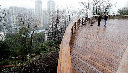 4個觀景平臺面積共4521平方米,由花崗巖或防腐木鋪裝,利用城市制高點,體現城市陽臺理念,游人可在公園內飽覽紅巖村、嘉陵江及江北鴻恩寺盛景。